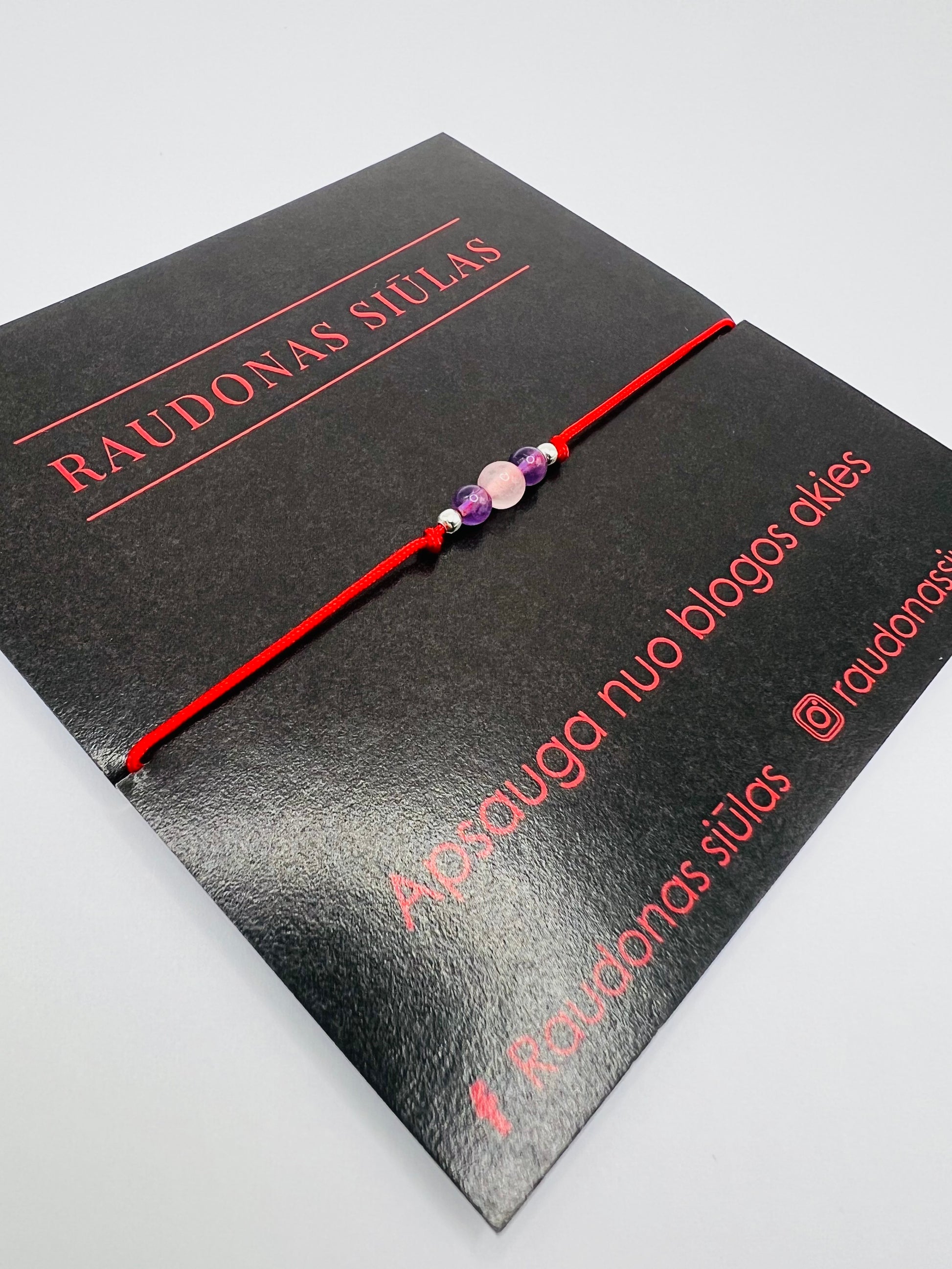 Ši elegantiška apyrankė pagaminta iš stiprybės ir apsaugos simboliu laikomo raudono siūlo, puošta dviem ypatingais akmenimis – raminančiu ametistu ir švelnią meilės energiją skleidžiančiu rožiniu kvarcu. Kiekviena detalė papildyta subtiliais sidabro elementais, kurie suteikia papuošalui prabangos bei išskirtinumo.