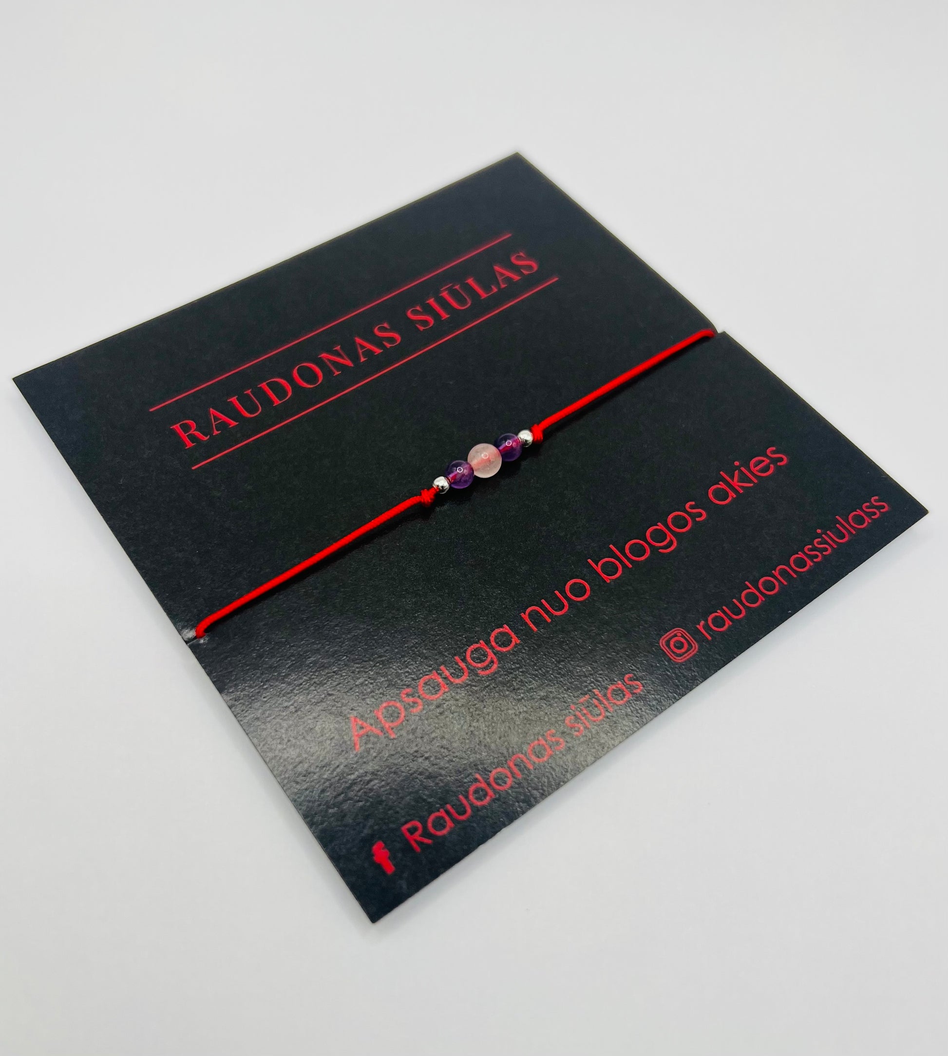 Raudono siūlo apyrankė su ametistu, rožiniu kvarcu ir sidabro spalvos detalėmis.