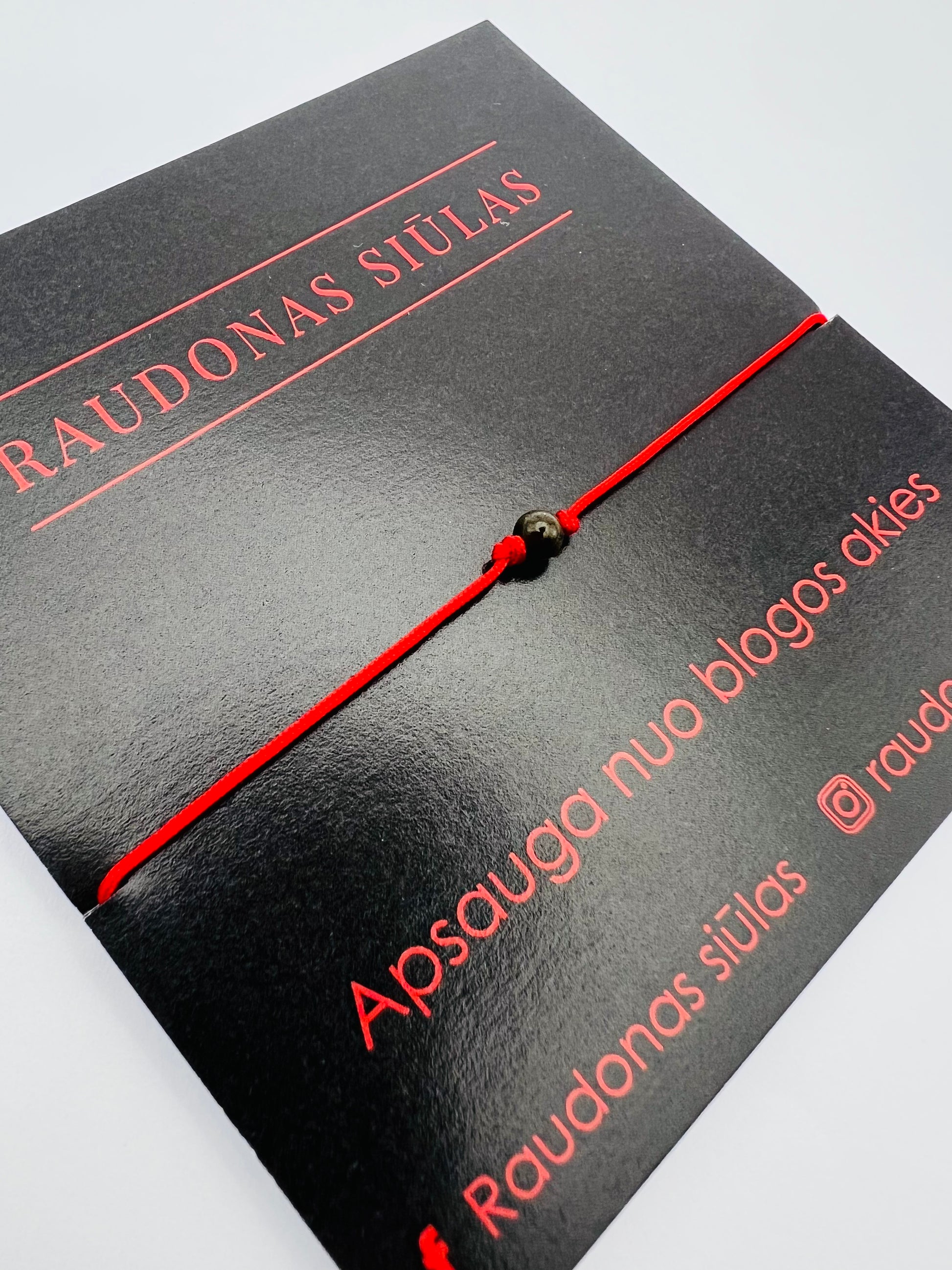 Rankų darbo raudono siūlo apyrankė su natūraliu auksinio obsidiano karoliuku – tai stiprios apsaugos, pasitikėjimo ir energijos balanso simbolis.
