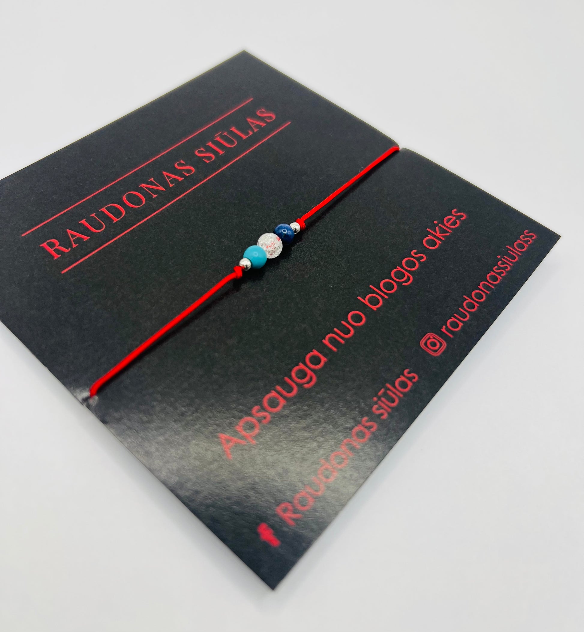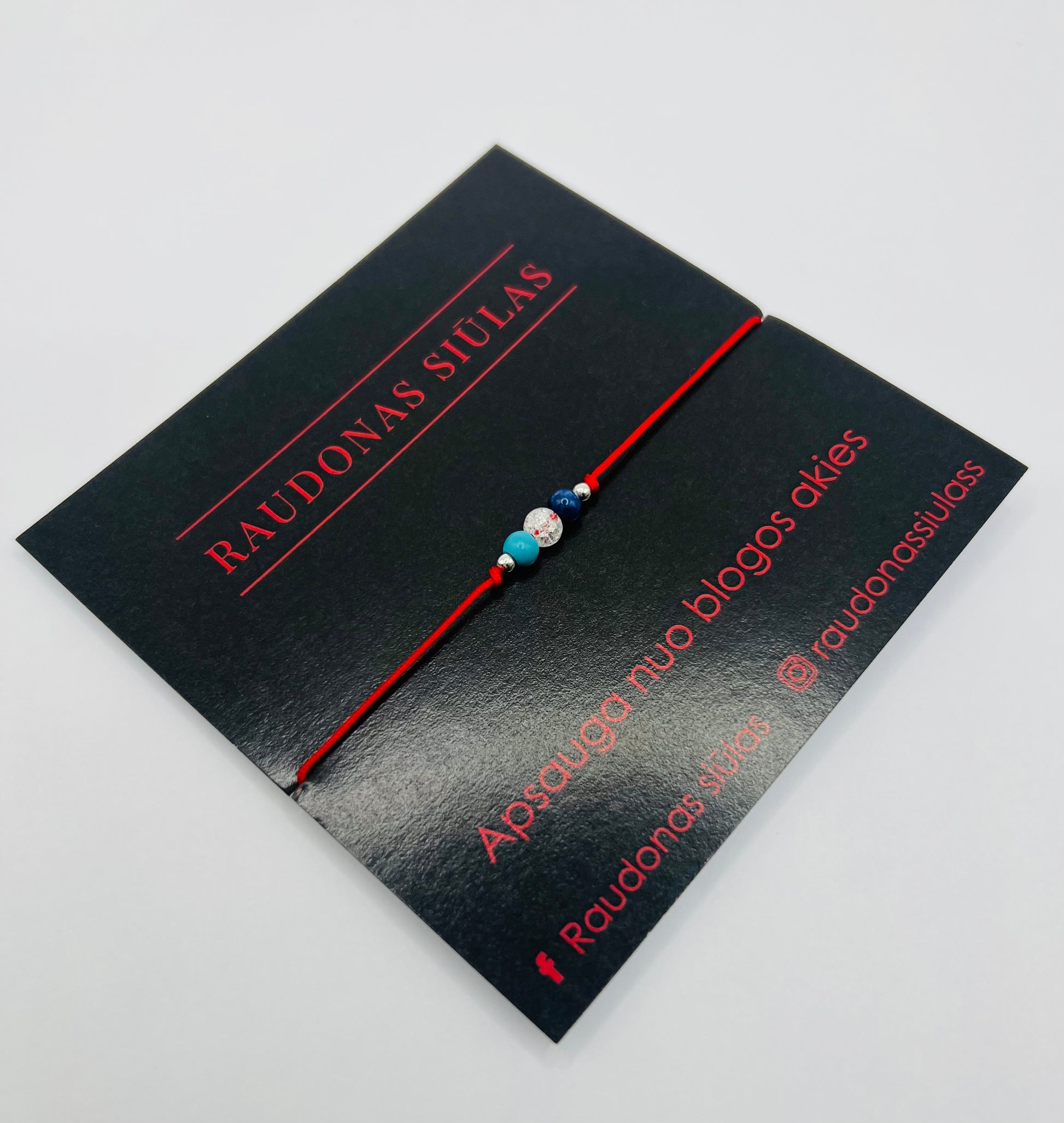 Iš apsaugą simbolizuojančio raudono siūlo sukurta apyrankė papuošta trimis ypatingais akmenimis – turkiu, kalnų krištolu ir lazuritu, o šonus išskirtinai puošia sidabro detalės, suteikiančios prabangos bei subtilios elegancijos.